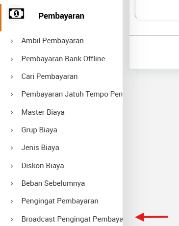 1. Buka Menu : Pembayaran > Broadcast Pengingat Pembayaran.