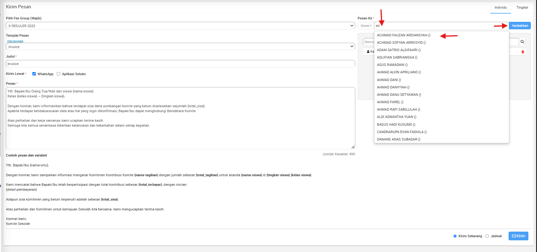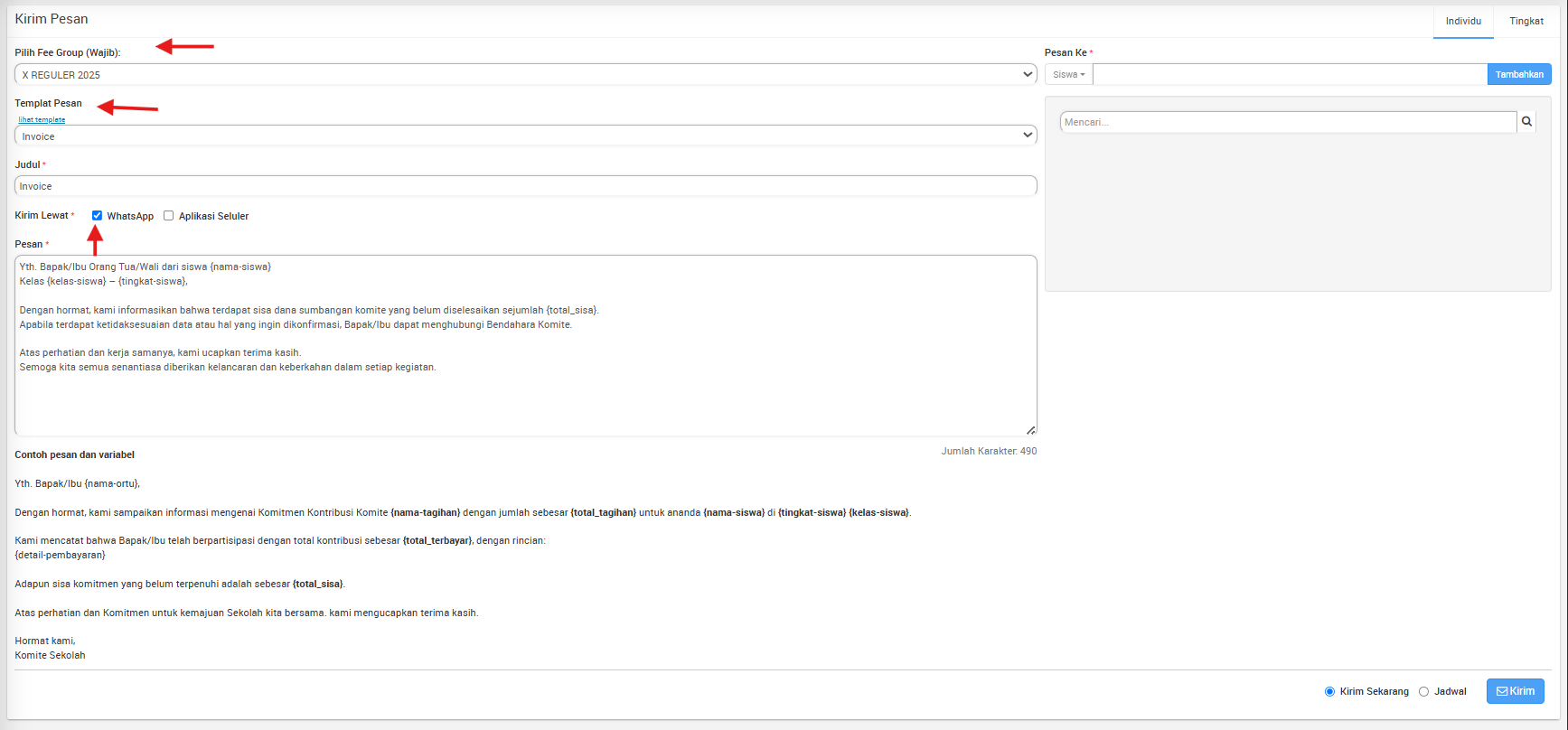 - dan pilih Pesan ke Siswa atau Wali Murid