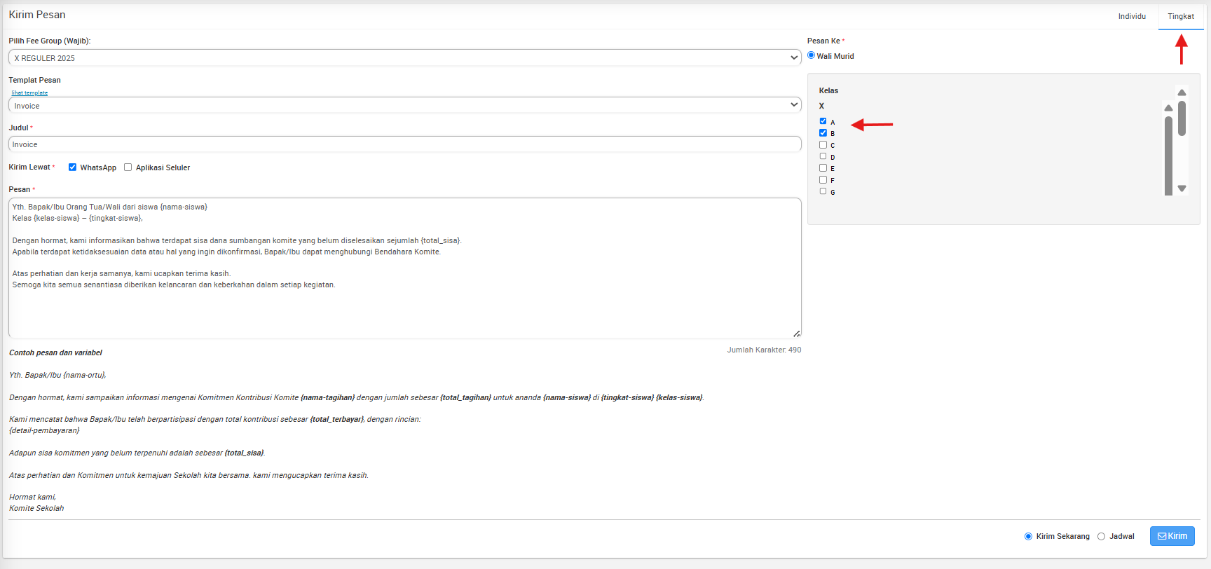 Pesan ke Wali di Menu Tingkat.