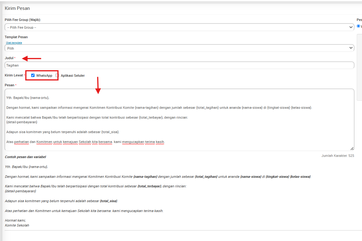 2. Setelah masuk di halaman kirim pesan pengingat pembayaran anda harus memilih :