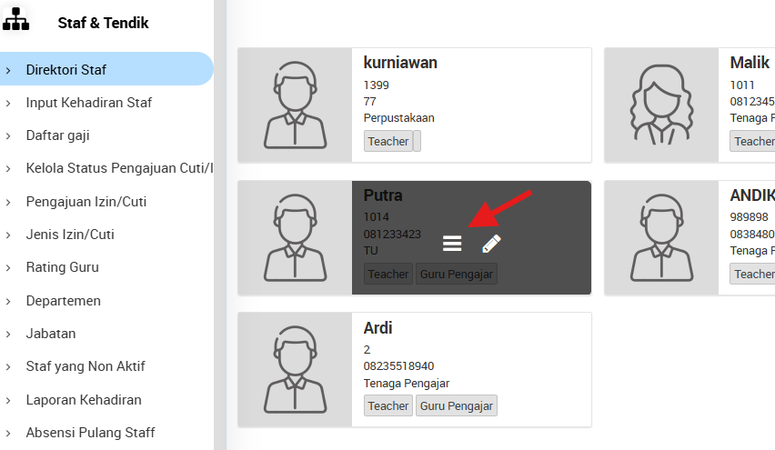 2. Hover pada area data guru yang akan di edit seperti digambar